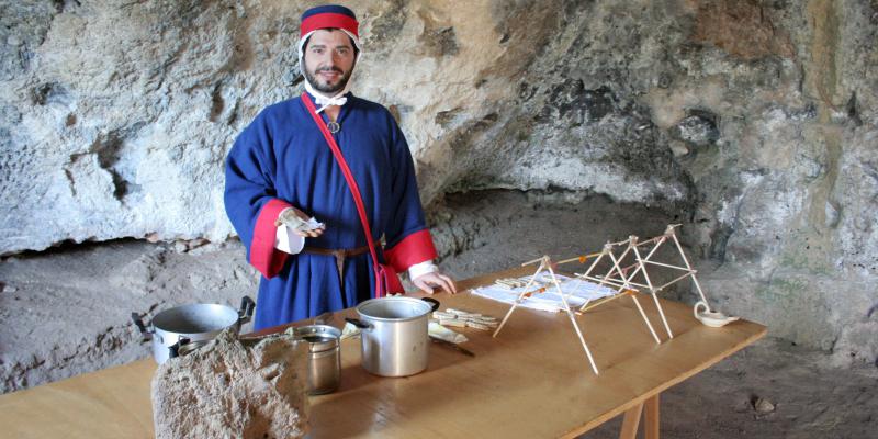 L'attività prevede la dimostrazione pratica delle antiche tecniche di tintura, condotta da un rievocatore storico in abiti di XIII secolo, all'interno di una delle grotte produttive del villaggio, per scoprire le erbe tintorie e le tecniche di colorazione dei tessuti nel Medioevo.